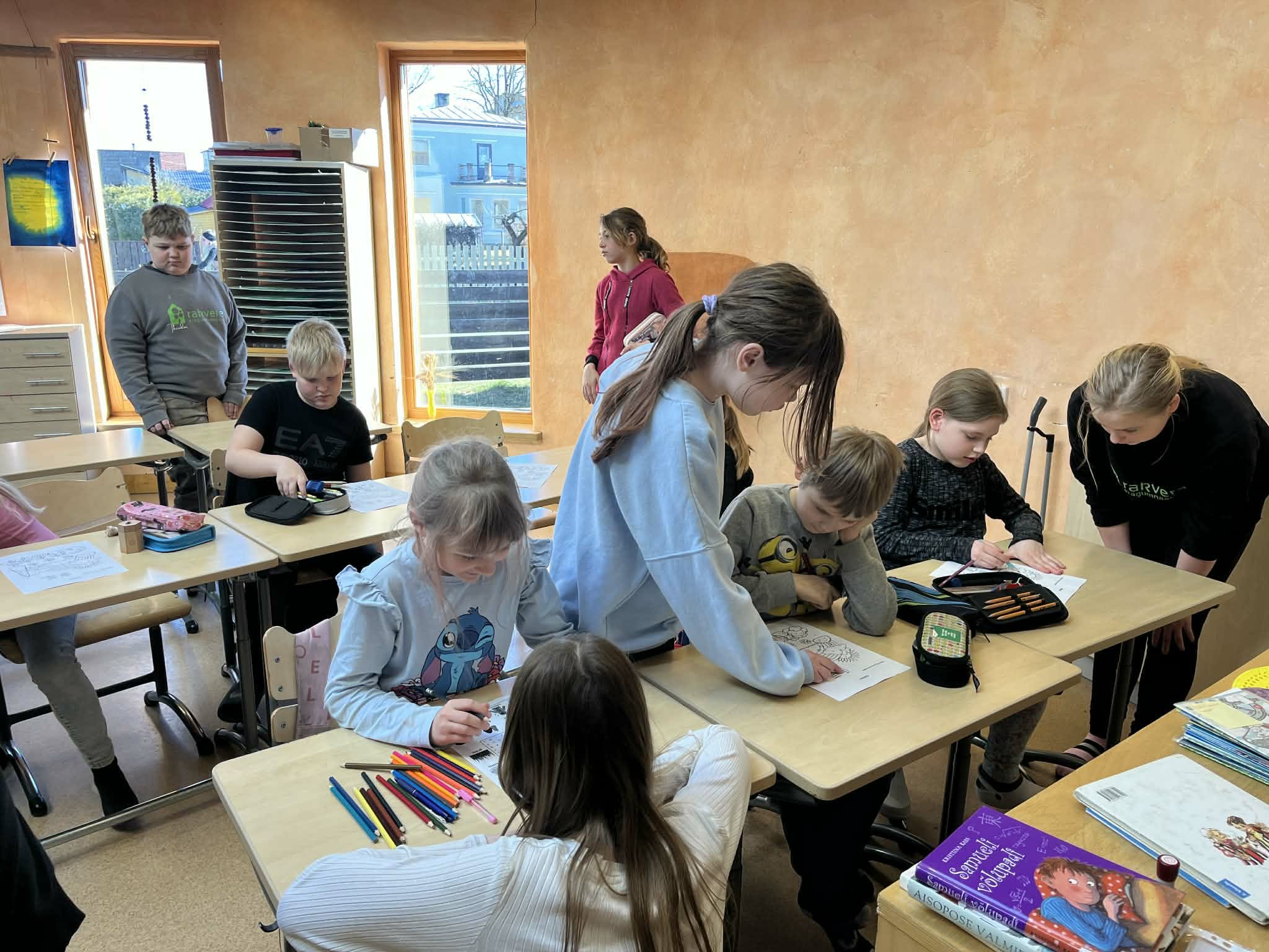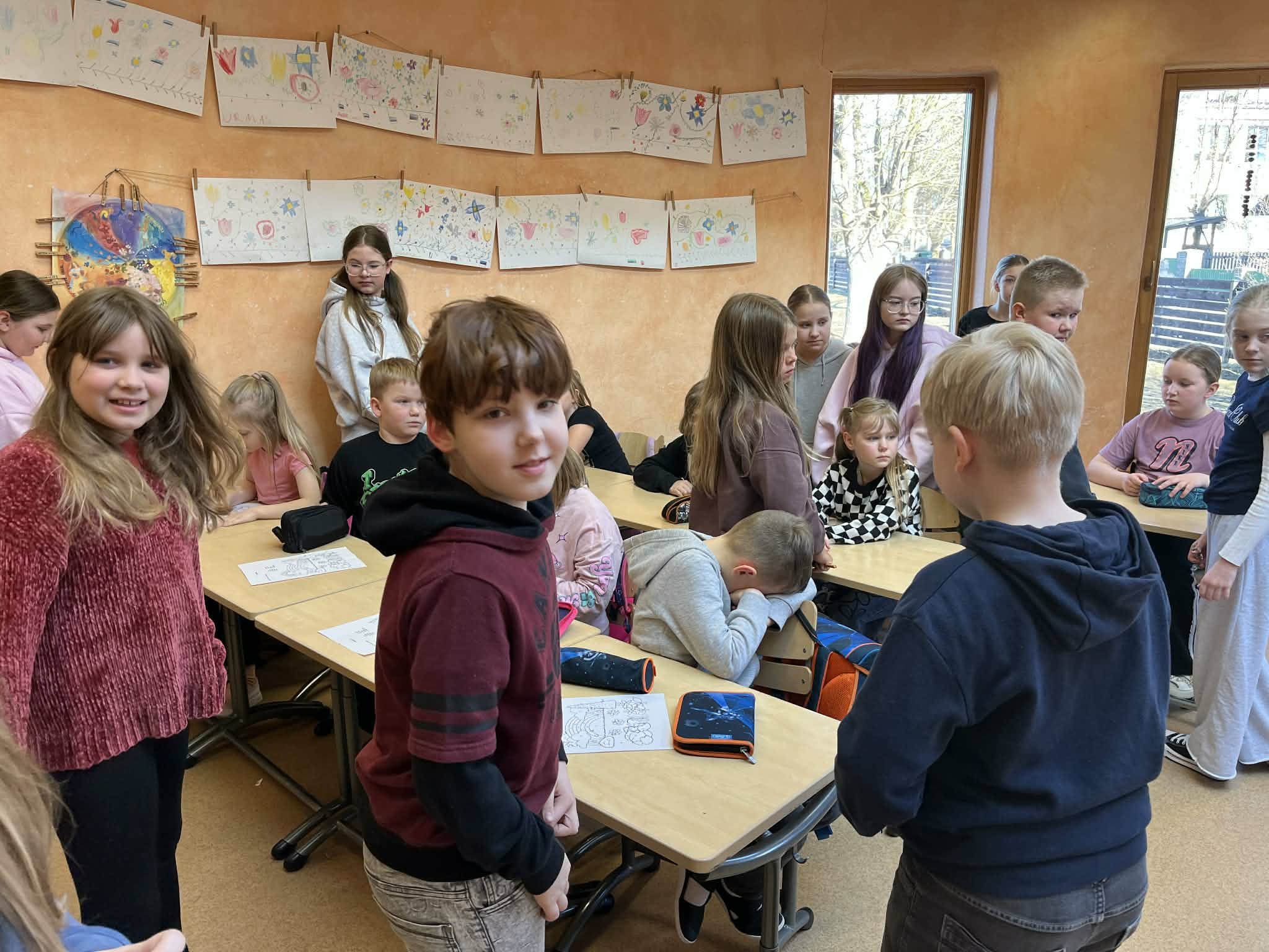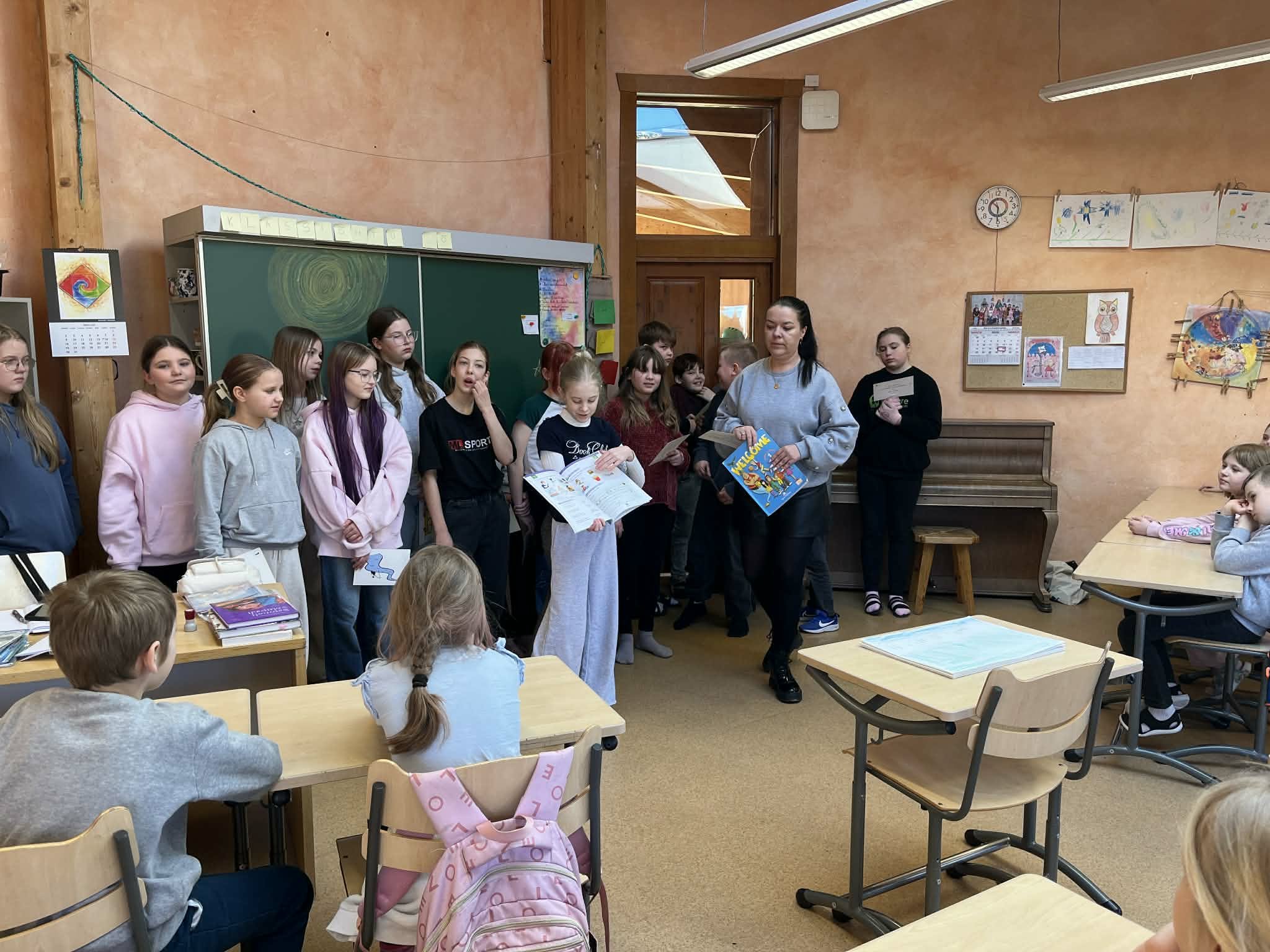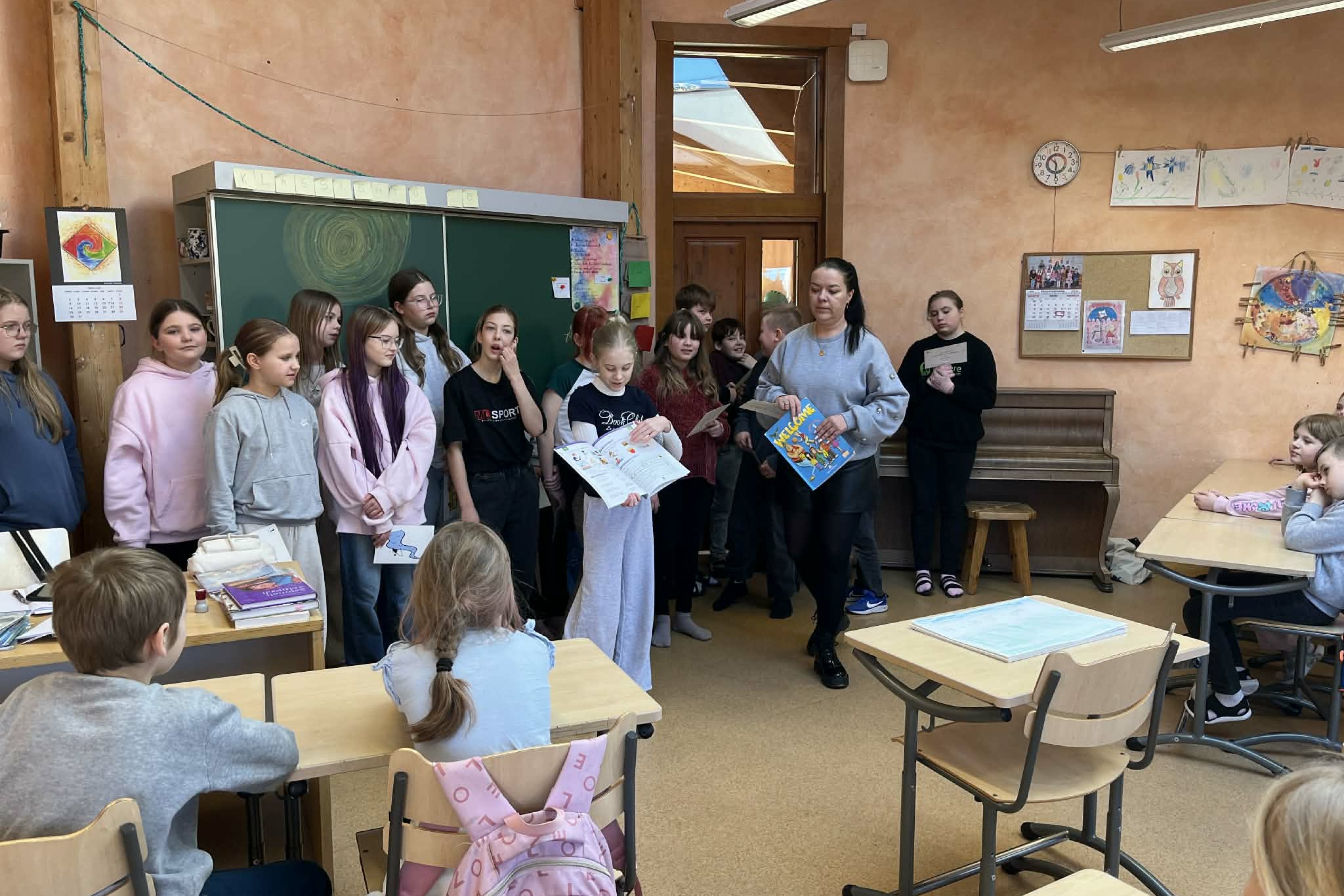 4. klassi õpilased viisid 2. klassi õpilastele läbi lühikese inglise keele tunni, kasutades lihtsaid mänge ja sõnavaraharjutusi. Õpetajaroll sobis lastele toredasti ja 2. klass sai aimu sellest, mis neid järgmisel õppeaastal ees ootab.
